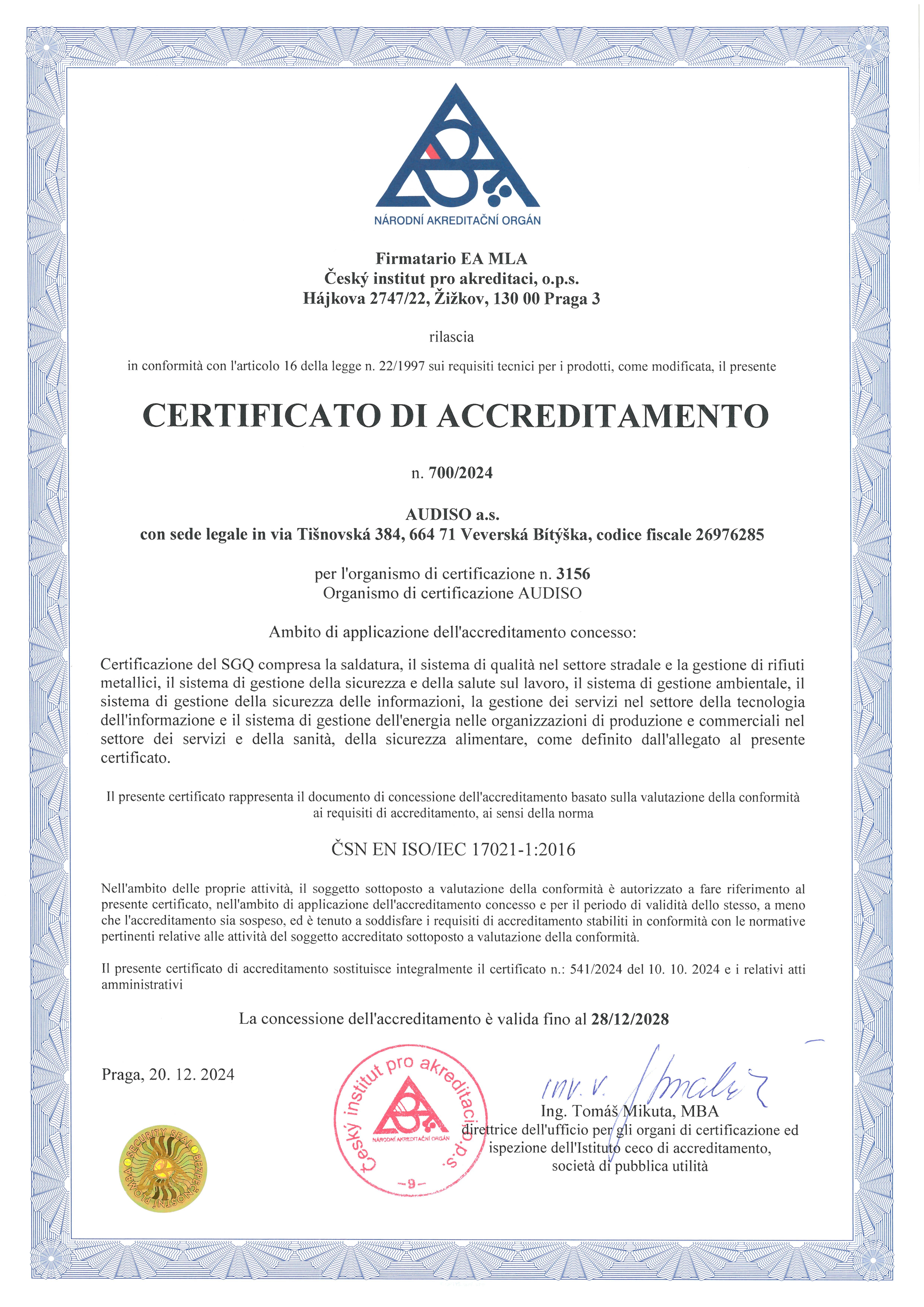 Organismo di Validazione e Verifica (VVO) accreditato dall'Istituto Ceco per l'Accreditamento, o.p.s. secondo ISO/IEC 17021 | ISO/IEC 17029